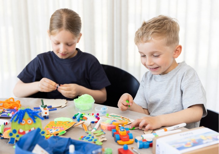 För lite äldre barn kan textildekoration kompletteras med små detaljer som filt, glitterlera, glitter och andra dekorativa element som ger möjlighet att leka med struktur och yta. På så sätt utvecklar textildekoration både kreativitet, finmotorik och självförtroende – i barnets eget tempo.