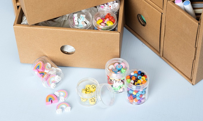 Varje pysselstation har ett extra fack med plats för en låda. Vi har tagit fram lådor som passar till varje station – så att du kan köpa en låda med fler smyckesdelar, ännu mer modellering eller material och pynt till textildekoration. Vi har också gjort en låda som passar till alla våra pysselstationer.